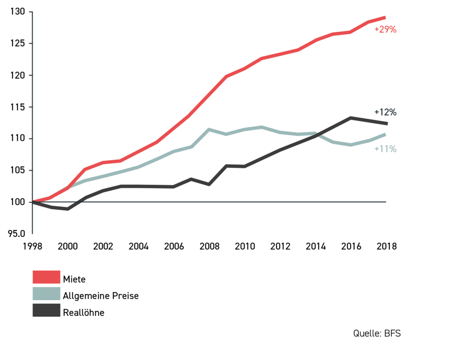 Die Situation auf dem Schweizer Wohnungsmarkt lässt sich schnell zusammenfassen: Es gibt nicht genügend bezahlbare Wohnungen. Die hohen Mieten belasten das Budget der Haushalte sehr stark. Für Arbeitnehmer und Arbeitnehmerinnen, aber auch für Jugendliche in der Ausbildung oder Rentnerinnen und Rentner verschlechtert sich die Situation ständig, weil die Mieten schneller steigen als Preise, Löhne und Renten.