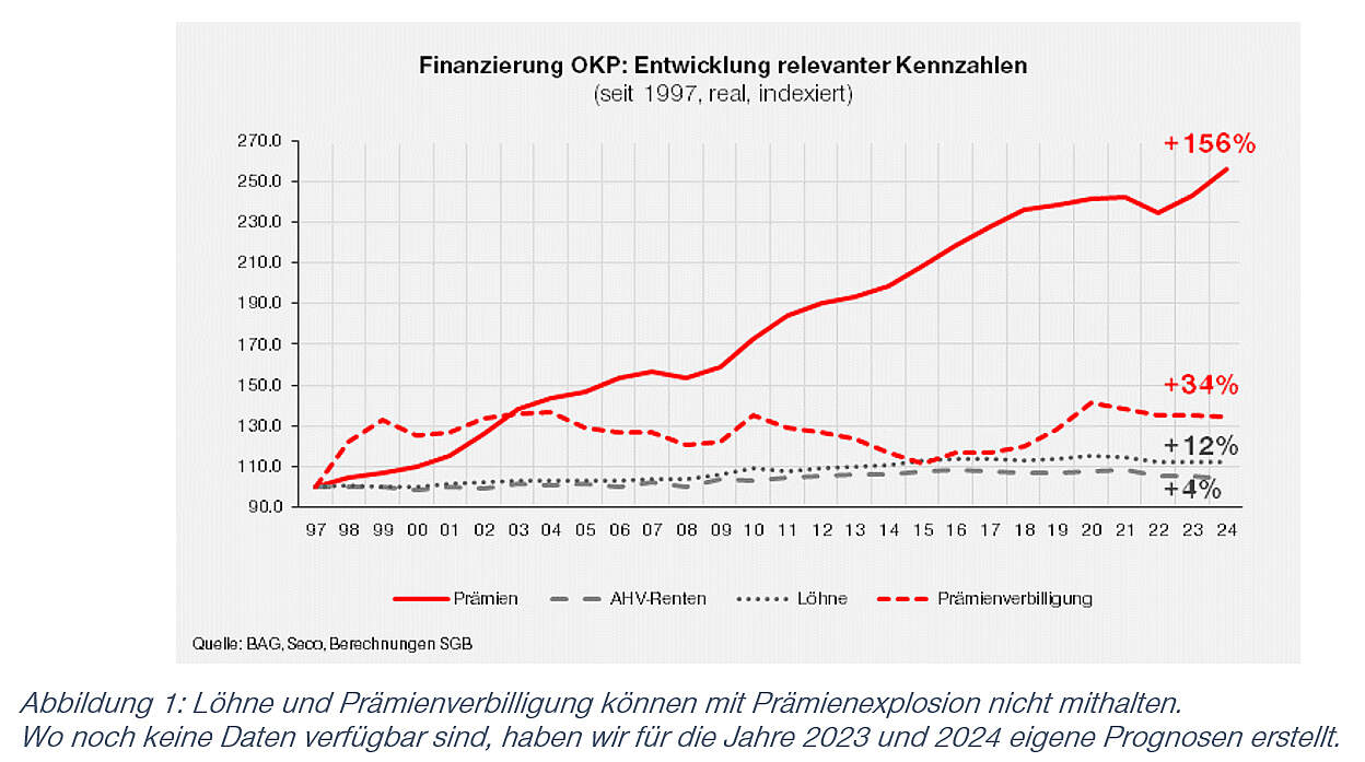 Wer arbeiten muss, um die Krankenversicherung bezahlen zu können, weiss es: Die Krankenkassenprämien steigen seit Jahren viel stärker als die Löhne. Die Prämien sind bereits heute auf einem unerträglich hohen Niveau. Ein durchschnittliches Schweizer Paar mit zwei Kindern musste dieses Jahr mehr als 1’000 Franken monatlich für die Krankenkasse bezahlen, selbst wenn es ein HMO-Modell mit Normalfranchise gewählt hat. Statt diesen unhaltbaren Zustand zu verbessern, steigen die Prämien 2024 erneut. Aber was heisst eine neuerliche Prämienerhöhung für den Wohlstand einer durchschnittlichen Familie? Geht man davon aus, dass die Familie ein verfügbares Einkommen von gut 10’000 Franken hat, muss man für den Zeitraum 2020 bis 2024 einen Wohlstandverlust prognostizieren. Zwar beträgt die Lohnerhöhung für diese Familie knapp 4’200 Franken, d. h. die Löhne sind um etwa 3 Prozent gestiegen. Aber wenn man erwartet, dass die Krankenkassenprämien im kommenden Jahr wieder um etwa 6.5 Prozent steigen, muss man die 3 Prozent Lohnwachstum einer Prämienexplosion von 13 Prozent gegenüberstellen. In einem Zeitraum von nur vier Jahren sind die jährlichen Kosten für die Krankenkassen um 1’300 Franken gestiegen. Im Klartext: Knapp ein Drittel der Lohnerhöhung hat es gar nie ins Portemonnaie der Familie geschafft, sondern wurde sogleich wieder von der Krankenversicherung aufgefressen. Hinzu kommt, dass auch die Kosten für Miete, Energie, Essen und Mobilität derart gestiegen sind, dass viele Arbeitnehmende einen Reallohnverlust hinnehmen müssen.