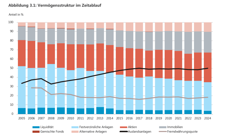 Wer Fremdwährungsanlagen hatte, verlor Geld. Viele wurden vorsichtiger. So auch zahlreiche Pensionskassen. Sie reduzierten den Fremdwährungsanteil auf unter 20 Prozent – vor allem über Wechselkursabsicherungen wie die Grafik unten aus einer Studie von Complementa zeigt. Ende 2024 lag dieser Anteil noch bei 16 Prozent. Zahlreiche institutionelle Anleger haben ihr Fremdwährungsrisiko aufgrund der erratischen Politik der neuen US-Regierung nochmals reduziert. Es wäre keine Überraschung, wenn der Anteil heute unter 16 Prozent liegen würde.