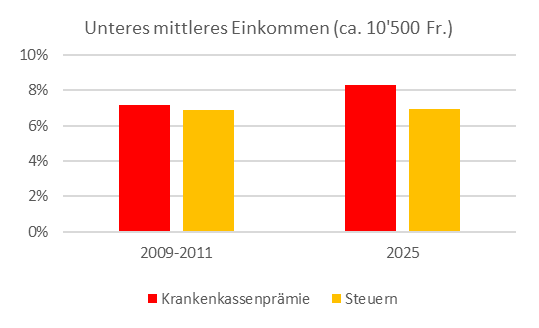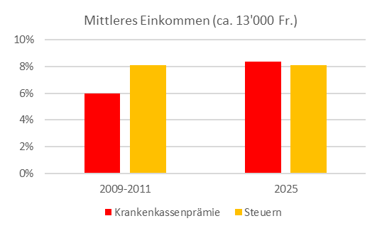 Heute zahlt die Mehrheit der Familien mit Kindern mehr Krankenkassenprämie als direkte Steuern. Die Steuerrechnung einer Familie mit mittleren Einkommen kostet ungefähr 1000 Franken pro Monat. Das war früher undenkbar. Für die mittlere Familie waren die Steuern immer höher als die Prämie. Doch während die Steuerbelastung ungefähr gleich geblieben ist, ist die Prämienlast markant höher. Bei einer Familie mit einem unteren mittleren Einkommen ist die Situation noch belastender. Sie zahlt weniger Steuern. Die Prämienlast ist aber ähnlich wie bei den mittleren Einkommen – ausser dass sie im Schweizer Durchschnitt rund 150 Franken Prämienverbilligung erhält.