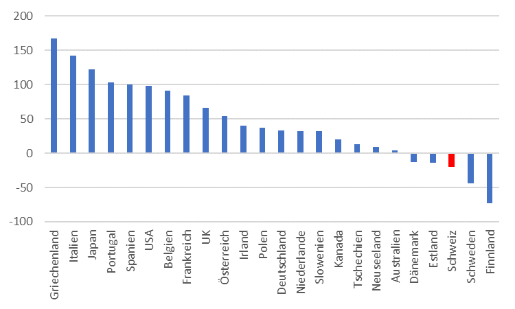 Der Bund, Kantone und Gemeinden gehören zur kleinen Minderheit der Staaten in Europa, die ein Nettovermögen ausweisen. In der Grafik aus OECD-Daten unten ist das mit einem negativen Balken dargestellt (negative Nettoschuld).