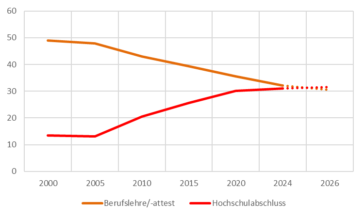 Die Berufslehre gehört zum Schweizer Nationalstolz. Was macht es mit dem Land, wenn es nun erstmals mehr Hochschulabsolvent:innen als Berufstätige mit einer Lehre gibt? Diese Frage wird voraussichtlich ab dem nächsten Jahr beantwortet werden. Wenn man die Entwicklung der letzten Jahre weiterführt, so dürften rund 31.5 Prozent der 25-64-Jährigen einen Hochschulabschluss haben und nur noch rund 30.5 Prozent eine abgeschlossene Lehre. Dazu kommt, dass der Anteil der Bevölkerung ohne Berufsabschluss wieder gestiegen ist.