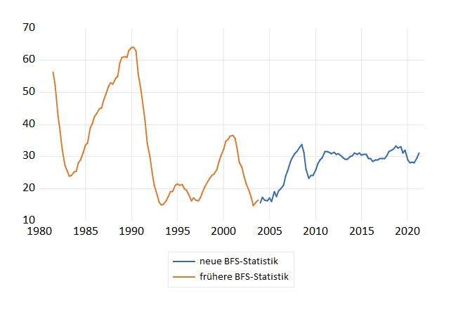 Doch zunächst zur aktuellen Lage. Obwohl die Corona-Krise noch nicht überwunden ist, klagen viele Arbeitgeber, dass sie Mühe hätten, qualifiziertes Personal zu finden. Tatsächlich sieht man in den Statistiken, dass die Rekrutierung von Arbeitskräften etwas schwieriger geworden ist. Doch im historischen Vergleich ist das Ausmass des Mangels ziemlich bescheiden. Rund 30 Prozent der Firmen meldeten dem Bundesamt für Statistik im 2. Quartal 2021, sie hätten Schwierigkeiten, qualifizierte Arbeitskräfte zu finden. Im Vergleich beispielsweise zu den 1980er-Jahren ist das alles andere als besorgniserregend. Dort suchten über Jahre hinweg 50 bis 60 Prozent der Betriebe intensiv Fachkräfte, wie die Grafik unten zeigt. Die Wirtschaft expandierte trotzdem – nämlich von 1985 bis 1990 mit 2.9 Prozent jährlich. Gegenüber beispielsweise 1.9 Prozent von 2014 bis 2019.