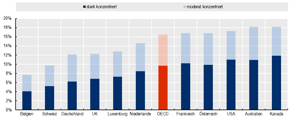 Die OECD hat das Ausmass der regionalen Marktmacht zu schätzen versucht. Diese beinhaltet - wie gesagt - nur eine Form von Marktmacht. Die Ergebnisse sind aber dennoch bemerkenswert. In der Schweiz arbeiten rund 10 Prozent der Berufstätigen der Privatwirtschaft in Berufen mit starker oder moderater Marktmacht der Arbeitgeber. Moderate Marktmacht kann heissen, dass es für einen Beruf in einer Region ungefähr 4 bis 5 Firmen gibt. Bei starker Marktmacht sind es deutlich weniger. In den öffentlichen Bereichen ist der Anteil natürlich viel grösser. Staaten mit weniger dicht besiedelten Regionen wie Australien oder Kanada, haben noch wesentlich höhere Konzentrationen.