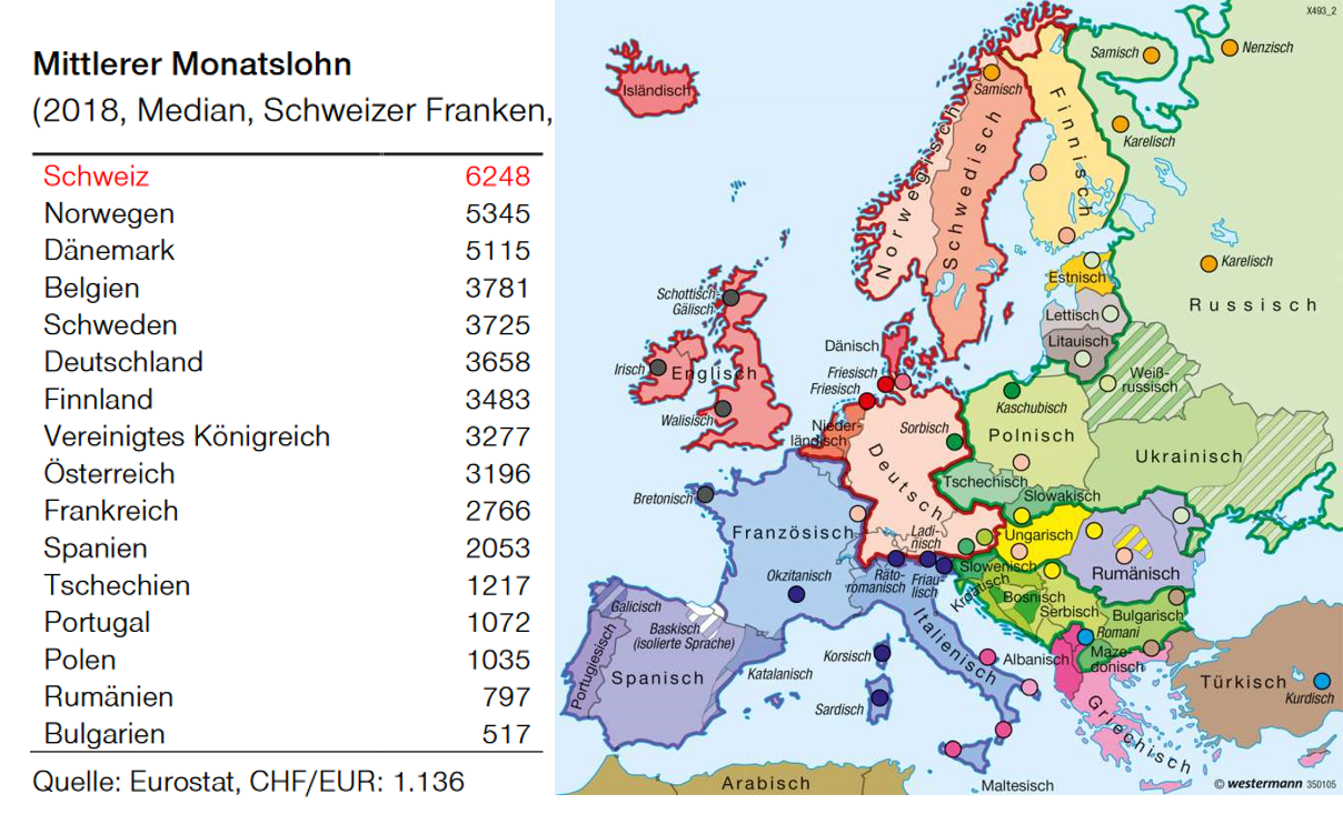 Auf die rund 8.8 Millionen EinwohnerInnen in der Schweiz gibt es rund 85 Millionen Deutsche, 65 Millionen FranzösInnen, 60 Millionen ItalienerInnen und 9 Millionen ÖsterreicherInnen. Total knapp 220 Millionen EinwohnerInnen. Oder anders gesagt: Fast die Hälfte der EU wohnt in einem Land mit einer Schweizer Landessprache – und einem spürbar tieferen Lohnniveau. Die potenzielle Konkurrenz, in der die Schweiz ausgesetzt ist, ist sehr gross.