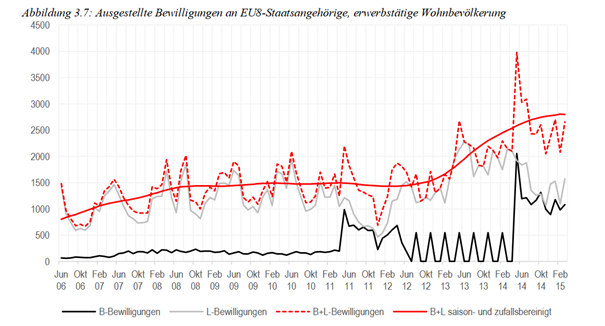 Als die Daueraufenthalte beschränkt wurden, wichen die Unternehmen aus. Sie stellten den neu aus dem Ausland angestellten nur noch befristete Verträge aus. Dadurch brauchten sie nur eine Kurzaufenthaltsbewilligung (L-Bewilligungen). In der Folge stiegen diese merklich an. Die Summe aus B- und L-Bewilligungen blieb hingegen weitgehend gleich. Das zeigen die Grafiken unten aus dem 11. Observatoriumsbericht des Bundes.