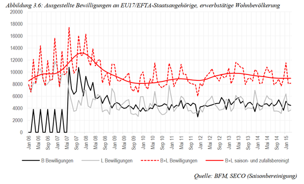 In den ersten Jahren der Personenfreizügigkeit konnte die Schweiz die Ausländer-Bewilligungen beschränken. Davon hat sie Gebrauch gemacht. Bis zum 1. Juni 2007 plafonierte der Bundesrat die Daueraufenthalts-Bewilligungen (B-Bewilligungen) für EU-17. Und von Juni 2006 bis Mai 2011 sowie von Mai 2012 bis Mai 2014 waren die B-Bewilligungen für Zuwandernde aus EU-8 begrenzt. Die Kurzaufenthalte und die Grenzgängerbewilligungen unterlagen hingegen nicht der Plafonierung – weil die Zahlen zu wenig hoch waren.