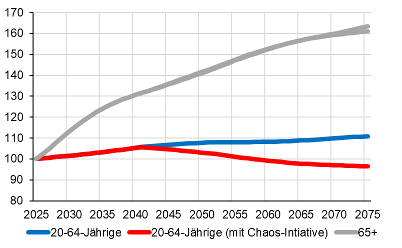 Bevölkerungsentwicklung nach Altersgruppe (2025=100, gemäss BFS-Szenario, Berechnungen SGB)