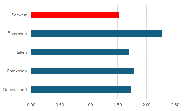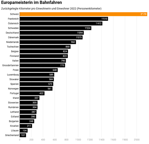 Allerdings ist die Pro-Kopf-Klimabelastung in den Ländern unterschiedlich, weil die Verkehrsinfrastruktur klimafreundlicher oder – schädlicher ist. Bekanntlich sind die SchweizerInnen EuropameisterInnen im Bahnfahren. Sie legen rund doppelt so viele Kilometer mit der Bahn zurück wie die Deutschen. Um von Bern nach Zürich zu gelangen, nehmen sogar BundesrätInnen oder Nationalbankdirektoren den Zug.