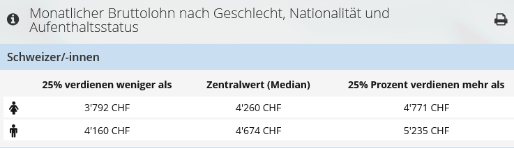 Hier ein Auszug aus dem Salarium-Lohnrechner des BFS, der die Löhne für Betreuerinnen im Sozialwesen im westlichen Mittelland ausweist (30-jährig, 5 Jahre Dienstalter). Die Hälfte dieser gelernten Frauen hat sogar weniger als 4260 Franken im Monat. Ihre Löhne sind sogar noch schlechter als die bereits tiefen Saläre ihrer männlichen Kollegen (4674 Franken). Obwohl sie teilweise sogar in staatsnahen Einrichtungen (Kitas u.a.) arbeiten.