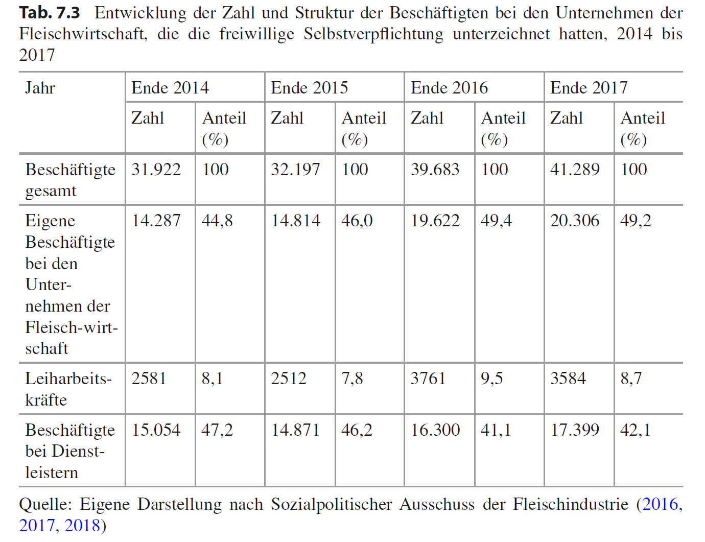 In Deutschland sind die Unterkünfte von gewissen Fleischverarbeitern ein Corona-Epidemieherd. Das ist leider nicht überraschend. Die Arbeitsbedingungen in der deutschen Fleischverarbeitung sind seit Jahren prekär. Vor allem weil die Branche mit unzähligen Subunternehmen arbeitet – davon viele aus den östlichen EU-Mitgliedstaaten. Diese stehen unter einem enormen Preis- und Konkurrenzdruck, den sie an die Arbeitnehmer weitergeben. Seit 2014 hat sich die Lage zwar etwas entschärft – u.a. wegen der Einführung des Mindestlohnes. Nach wie vor sind aber die Hälfte der Arbeitnehmenden in der Branche nicht bei den Firmen selber angestellt, sondern bei Subunternehmen («Dienstleister») oder bei Temporärfirmen (s. das Buch von Bosch et al.).