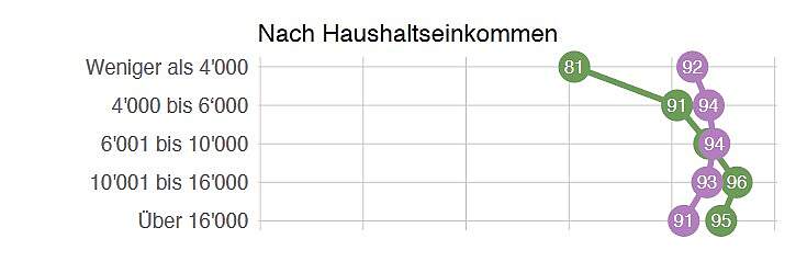 Gemäss einer Erhebung von SRG/Sotomo haben Haushalte mit einem Einkommen von unter 4000 Fr. durch die Krise einen Einkommensverlust von 19 Prozent erlitten. Ihnen stehen heute noch 81 Prozent des früheren Einkommens zur Verfügung. Auch die Topverdienenden haben zwar Einbussen von 5 Prozent. Gleichzeitig konnten sie aber ihre Lebenshaltungskosten um 9 Prozent senken (Homeoffice u.a.).