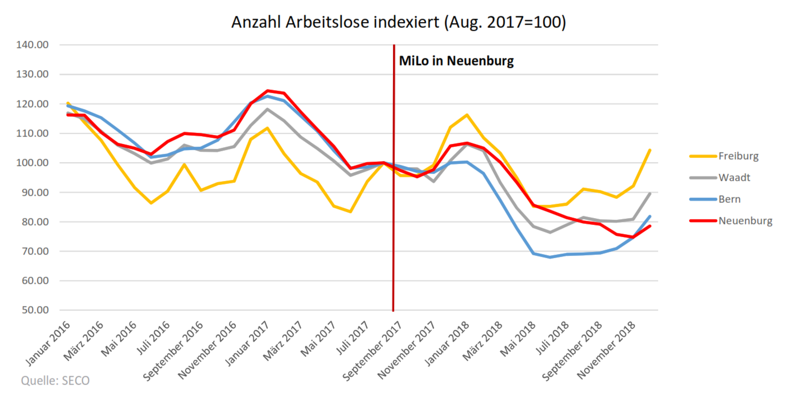 Eineinhalb Jahre später, dürften sich diese Kreise verwundert die Augen reiben: Von August 2017 bis Dezember 2018 sank die Arbeitslosenquote Neuenburgs von hohen 5,3% auf 4,1%. Im gleichen Zeitraum erhöhte sich die Arbeitslosenquote im Mindestlohnfreien Nachbarkanton Freiburg von 2,8% auf 3,1%. Und auch in den weiteren Nachbarkantonen, Waadt und Bern, ist die Zahl der Arbeitslosen weniger stark zurückgegangen als im Kanton Neuenburg (vgl. Grafik). Auch punkto Beschäftigungsentwicklung schneidet der Kanton Neuenburg in den eineinhalb Jahren seit Einführung des Mindestlohnes besser ab als die Grossregion Espace Mittelland, welche neben Neuenburg die Kantone Bern, Freiburg, Solothurn und Jura umfasst.