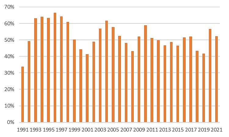 Anteil der Erwerbslosen, der bei einem RAV eingeschrieben ist (gemäss BFS)