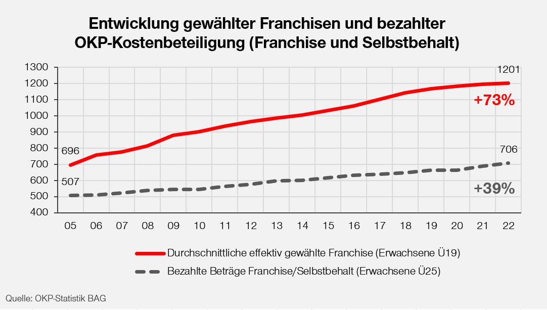 Je nach gewählter Franchise müssen die ersten 300 bis 2’500 Franken Behandlungskosten direkt aus der eigenen Tasche beglichen werden. Dazu kommt der Selbstbehalt (10 Prozent der Kosten, manchmal mehr) und die Tagespauschale im Spital. Wie die Prämien, sind in den vergangenen Jahren auch diese direkten Kostenbeteiligungen stark angestiegen. Im Jahr 2005 (seit dann gelten die aktuellen Franchisestufen) betrugen sie pro versicherte Person noch 507 Franken, heute sind es bereits 706 Franken (siehe obenstehende Grafik). Interessant dabei: Im selben Zeitraum hat die effektiv von den Versicherten gewählte Franchise mehr als doppelt so stark zugenommen. Heute beträgt die durchschnittlich gewählte Franchise 1’201 Franken. Hauptgrund hierfür ist ganz einfach, dass aufgrund der stark gestiegenen Prämien immer mehr Versicherte eine höhere Franchisestufe wählen, weil sie dadurch bis zu 1’500 Franken pro Jahr sparen können. Das Problem: Werden sie dennoch krank, wird Gesundheit für sie erst recht unbezahlbar.