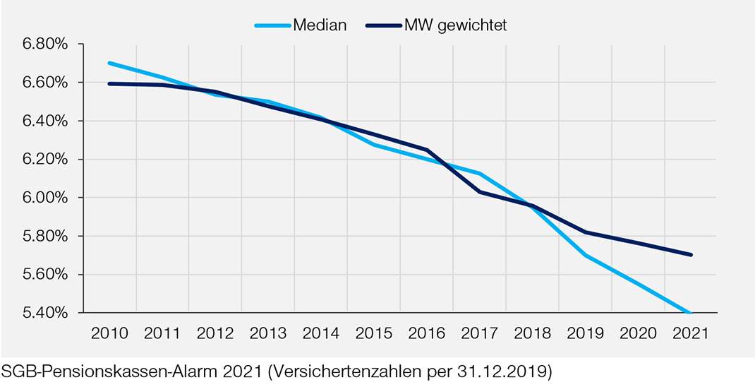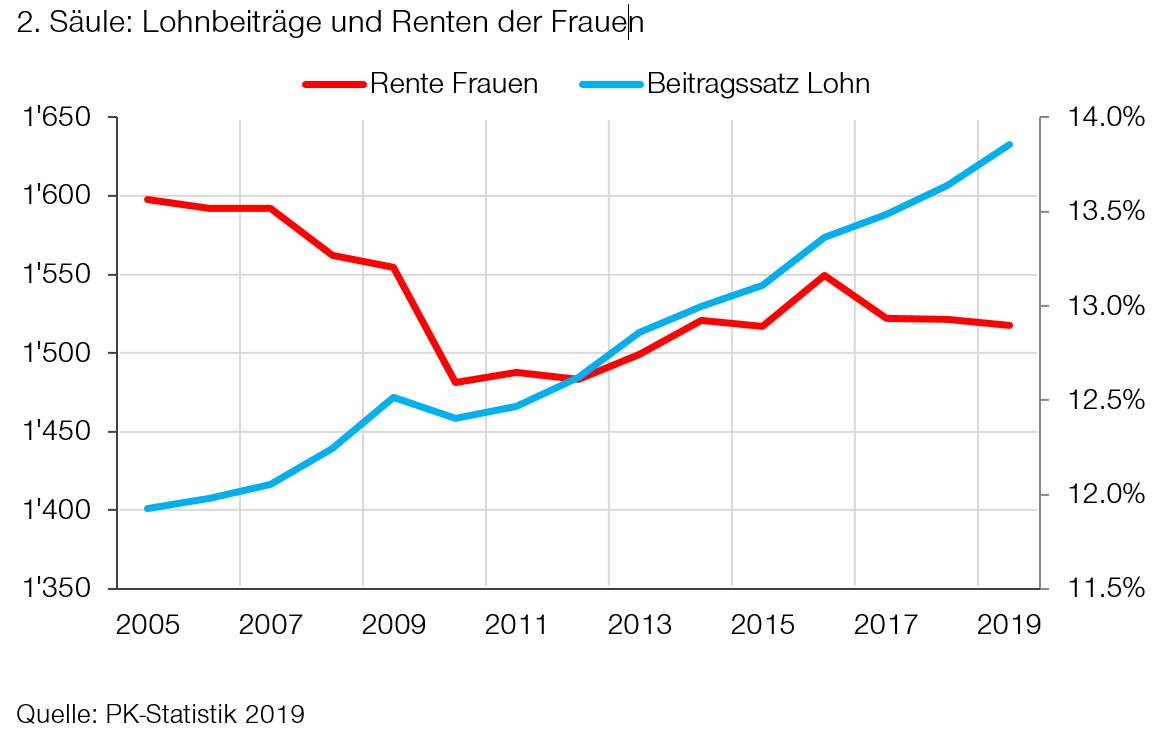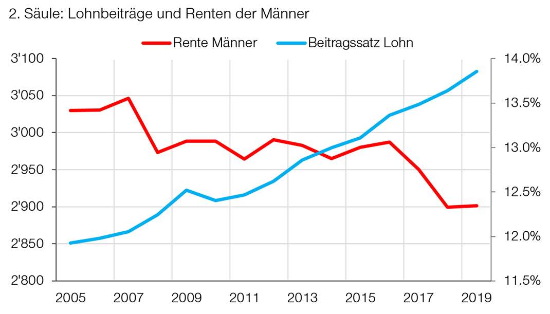 2021 wird der Druck auf die Renten der 2. Säule weiter zunehmen. Viele Pensionskassen haben bereits weitere Senkungen der technischen Zinssätze und der Umwandlungssätze beschlossen. Grund dafür sind die tiefen Zinsen.Tiefe Zinsen sind für die nach dem Kapitaldeckungsverfahren finanzierte 2. Säule besonders schwer zu verkraften. Und sie sind ökonomisch nicht sinnvoll. Denn wenn die Renditen auf den Altersguthaben tiefer ausfallen als das Lohnwachstum, lohnt es sich, die Renten aus den Lohnbeiträgen direkt zu zahlen.