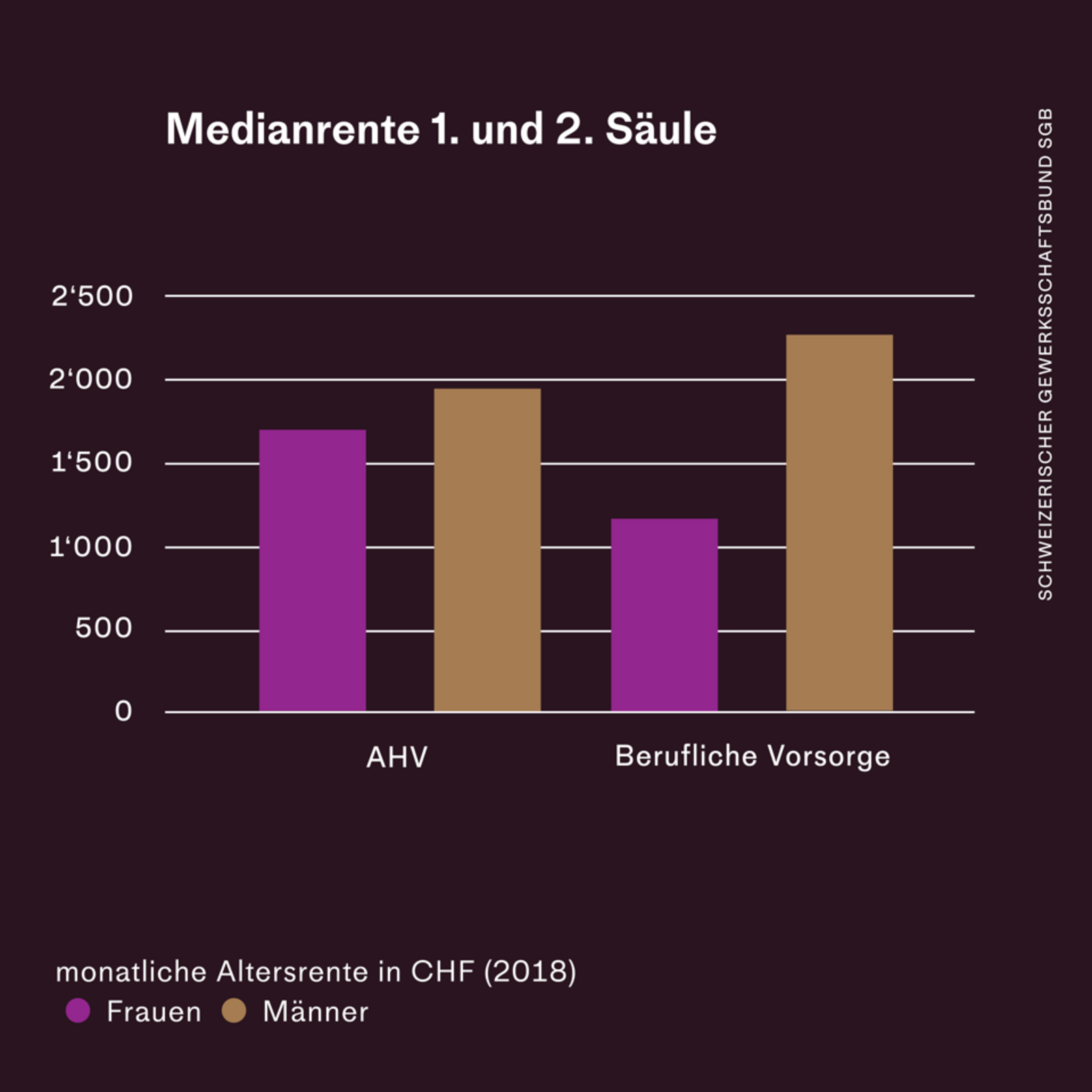 Die Frauenrenten sind viel zu niedrig. Weil ihre Lebensläufe durch Erwerbsunterbrüche, Teilzeitarbeit, strukturelle und individuelle Lohndiskriminierung geprägt sind, sind die Pensionskassen-Renten von Frauen 50% niedriger als die der Männer. Darum: Frauenrenten müssen endlich steigen!