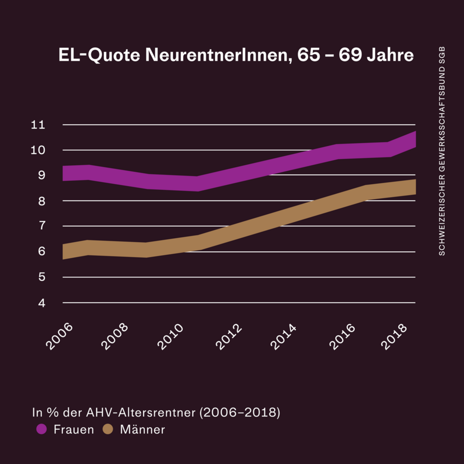 Es ist deshalb eine traurige Realität, dass fast 11 Prozent aller Frauen direkt beim Renteneintritt Ergänzungsleistungen beantragen müssen, um über die Runden zu kommen. 2019 bezogen insgesamt über 140‘000 Frauen Ergänzungsleistungen – bei den Männern sind es halb so viele. Besonders betroffen sind geschiedene und verwitwete Frauen.