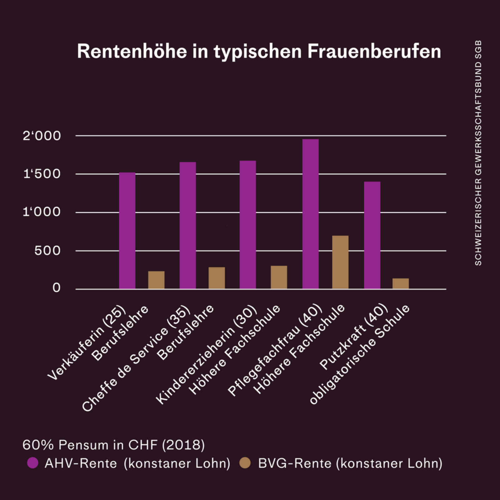 Die Hälfte der Frauen, die 2018 pensioniert wurden, erhält eine PK-Rente unter 1165 Franken pro Monat. In typischen Frauenbranchen sind PK-Renten zwischen 500 und 800 Franken pro Monat üblich; das reicht nicht zum Leben.