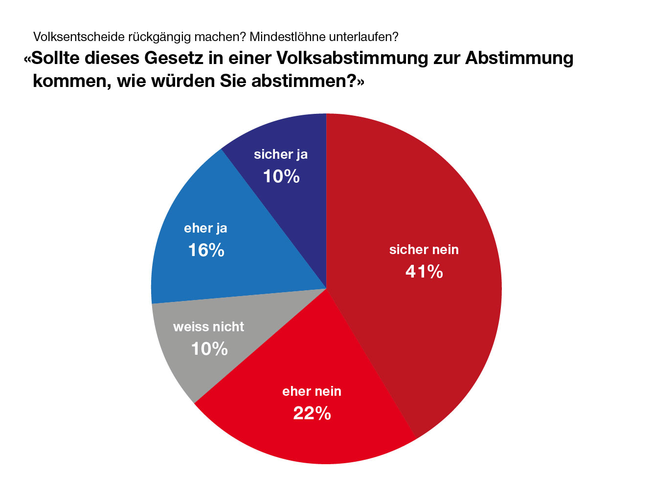 Eine repräsentative Umfrage im Auftrag des Schweizerischen Gewerkschaftsbundes zeigt klar: Die Schweiz will keine Lohnsenkung per Gesetz. 63 Prozent der Stimmbevölkerung würden ein Gesetz ablehnen, das erlaubt, kantonale oder kommunale Mindestlohnregelungen zu umgehen, wenn ein Gesamtarbeitsvertrag tiefere Mindestlöhne vorsieht. Nur 26 Prozent wären dafür und zehn Prozent sind unentschieden.