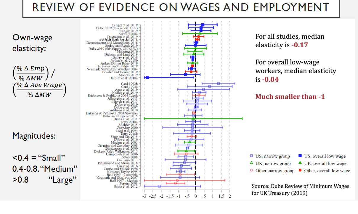 Diese Marktmacht wurde in den letzten Jahren vertieft erforscht. Die heute vorliegende Evidenz zeigt, dass staatliche Mindestlöhne aus diesem Grund meist keine signifikant negativen Beschäftigungswirkungen haben. Der Mindestlohnforscher Dube hat die Ergebnisse in einer eindrücklichen Grafik zusammengestellt.